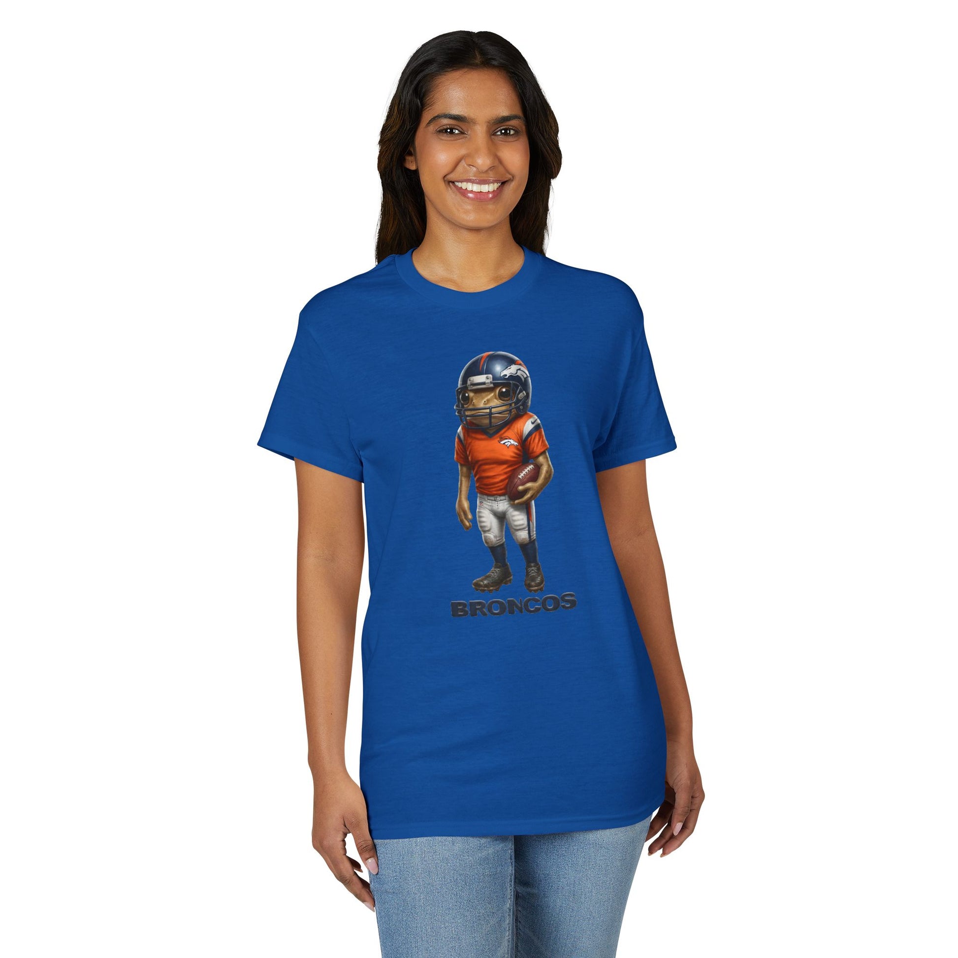 A soft, breathable tee that brings game-day spirit to everyday wear. The front features a stylized, slightly vintage football player illustration in team colors with a bold, textured team name beneath. The medium-weight DryBlend fabric feels sturdy yet comfortable, wicks moisture, and holds printed details with crisp clarity. Wear it to watch the game, run errands, or layer under a jacket — it settles into the rhythm of active days and relaxed weekends. The ribbed collar stretches and snaps back, taped seams add structure, and the tear-away tag keeps the neckline itch-free. This shirt ages well while keeping the artwork sharp, so your fandom reads as lived-in and authentic rather than flashy.