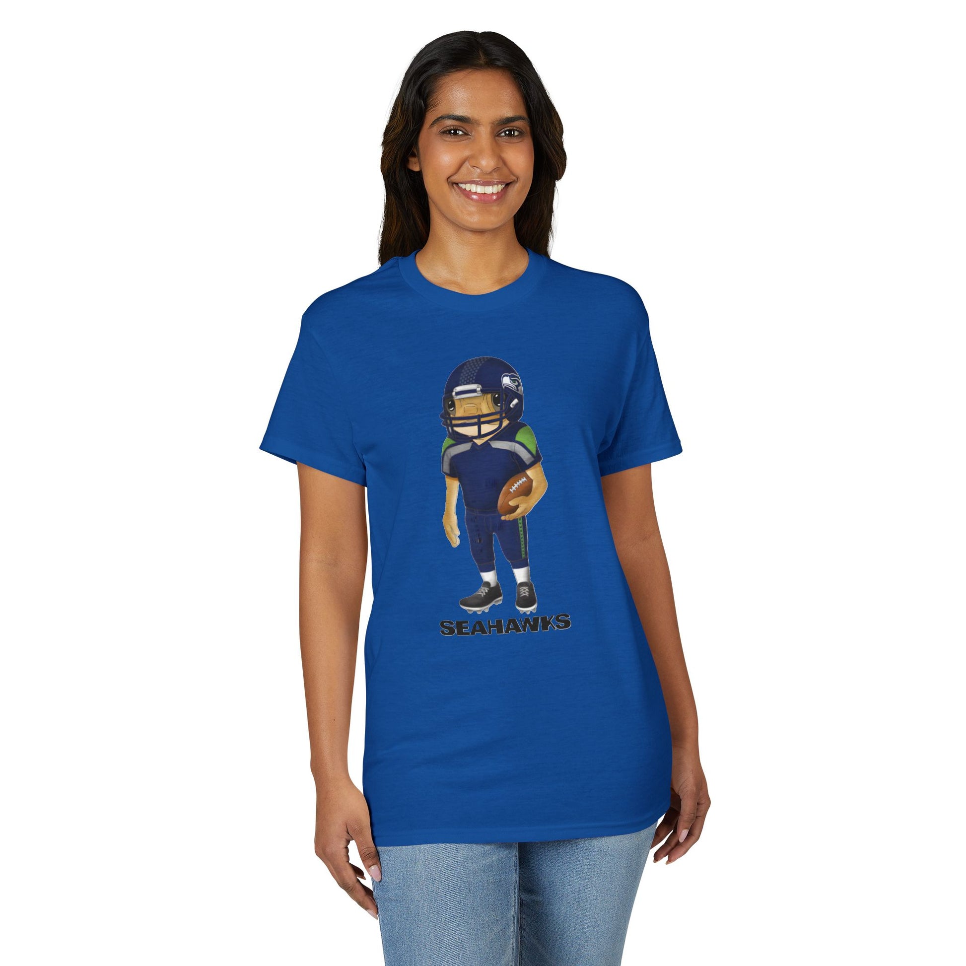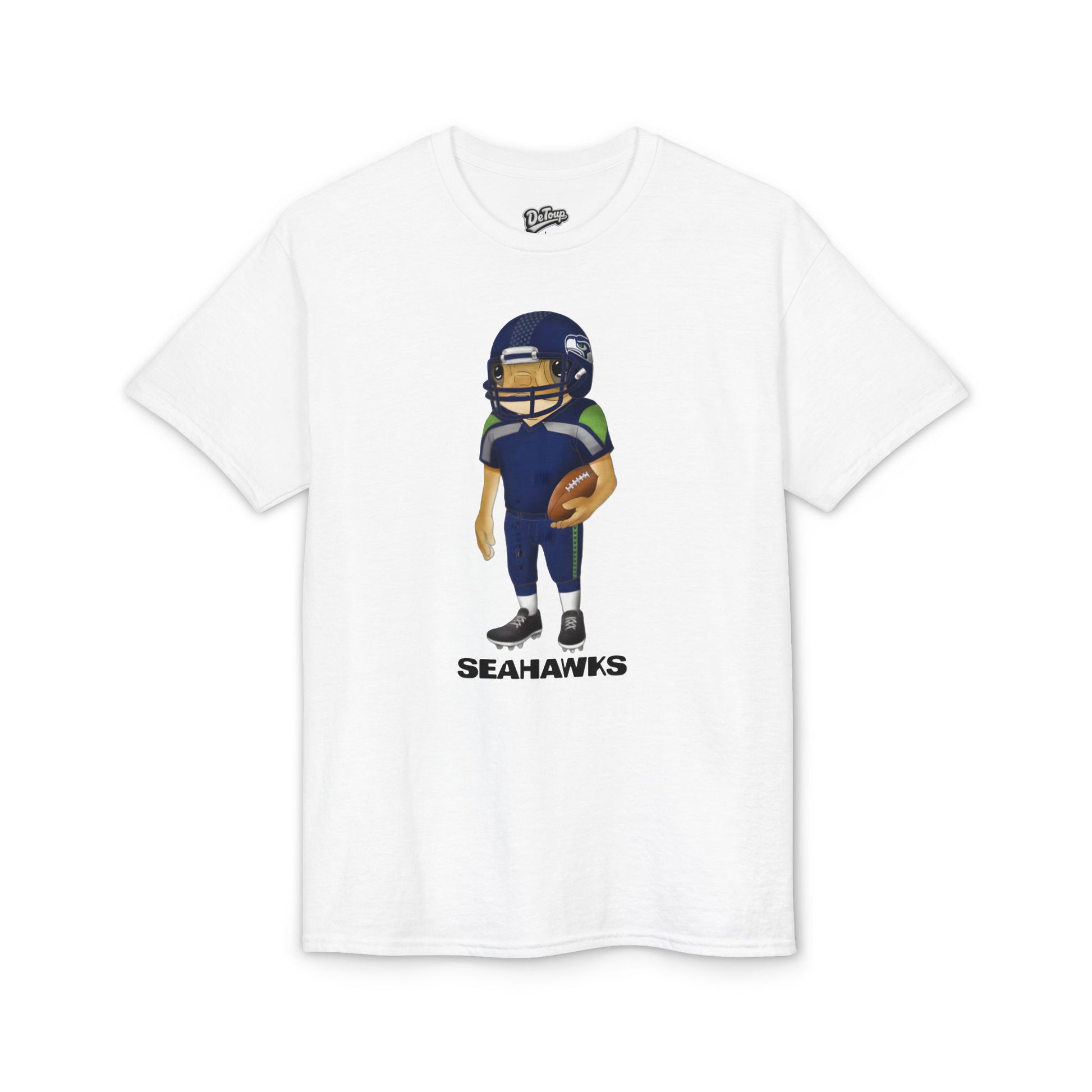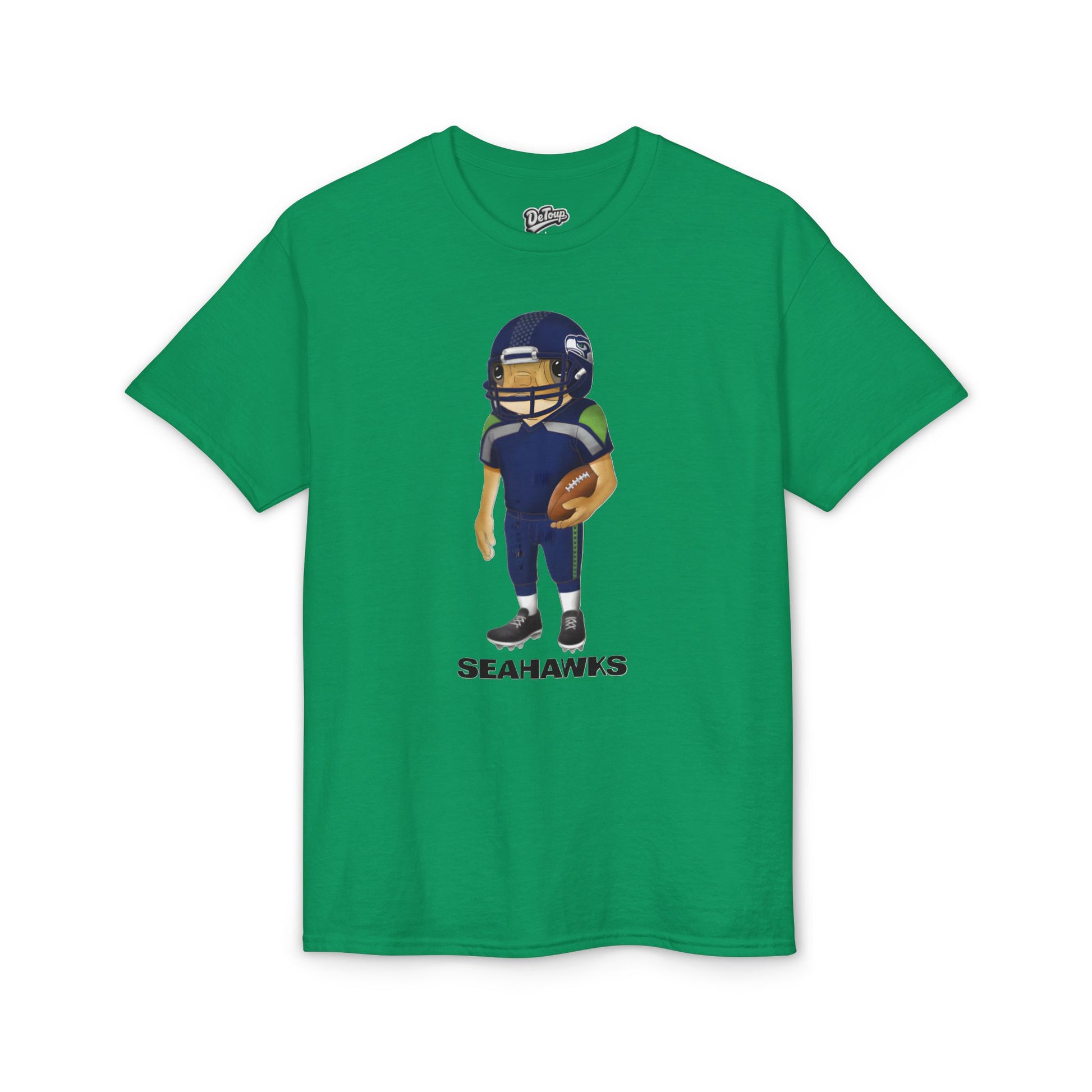 A soft, breathable tee that blends everyday comfort with playful team spirit. The shirt features a bold, cartoon-style football player front-and-center, rendered in deep navy and green tones with a textured, hand-drawn feel. It drapes casually on the body and moves with you—thanks to moisture-wicking DryBlend® fabric—so it’s comfortable during a backyard barbecue, a neighborhood tailgate, or while cheering from the couch. The ribbed collar keeps its shape through wear and wash, while tear-away tags eliminate itch so attention stays on the game, not the garment. This shirt is for fans who like a relaxed, sporty look with a touch of personality and durable print quality that holds up wear after wash.