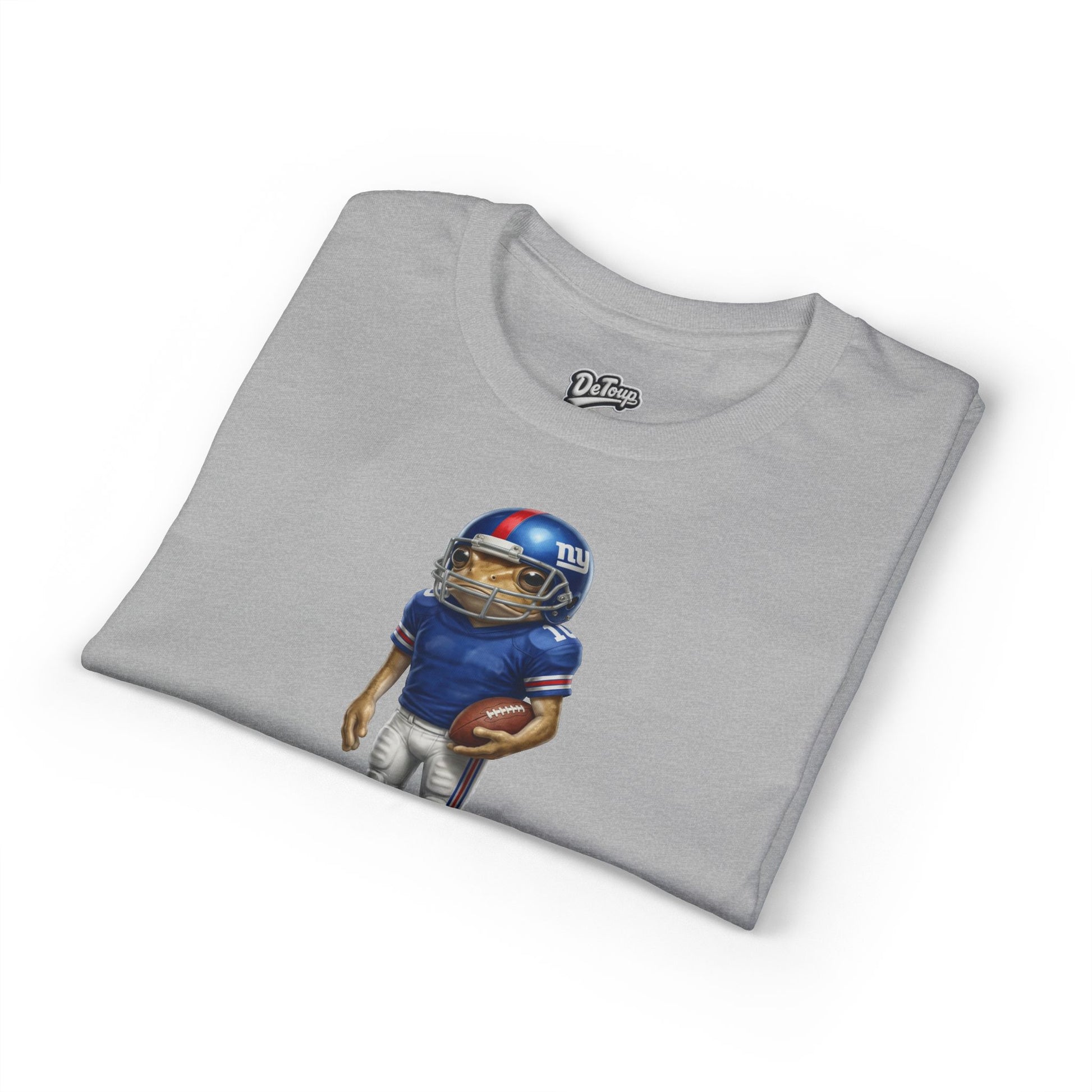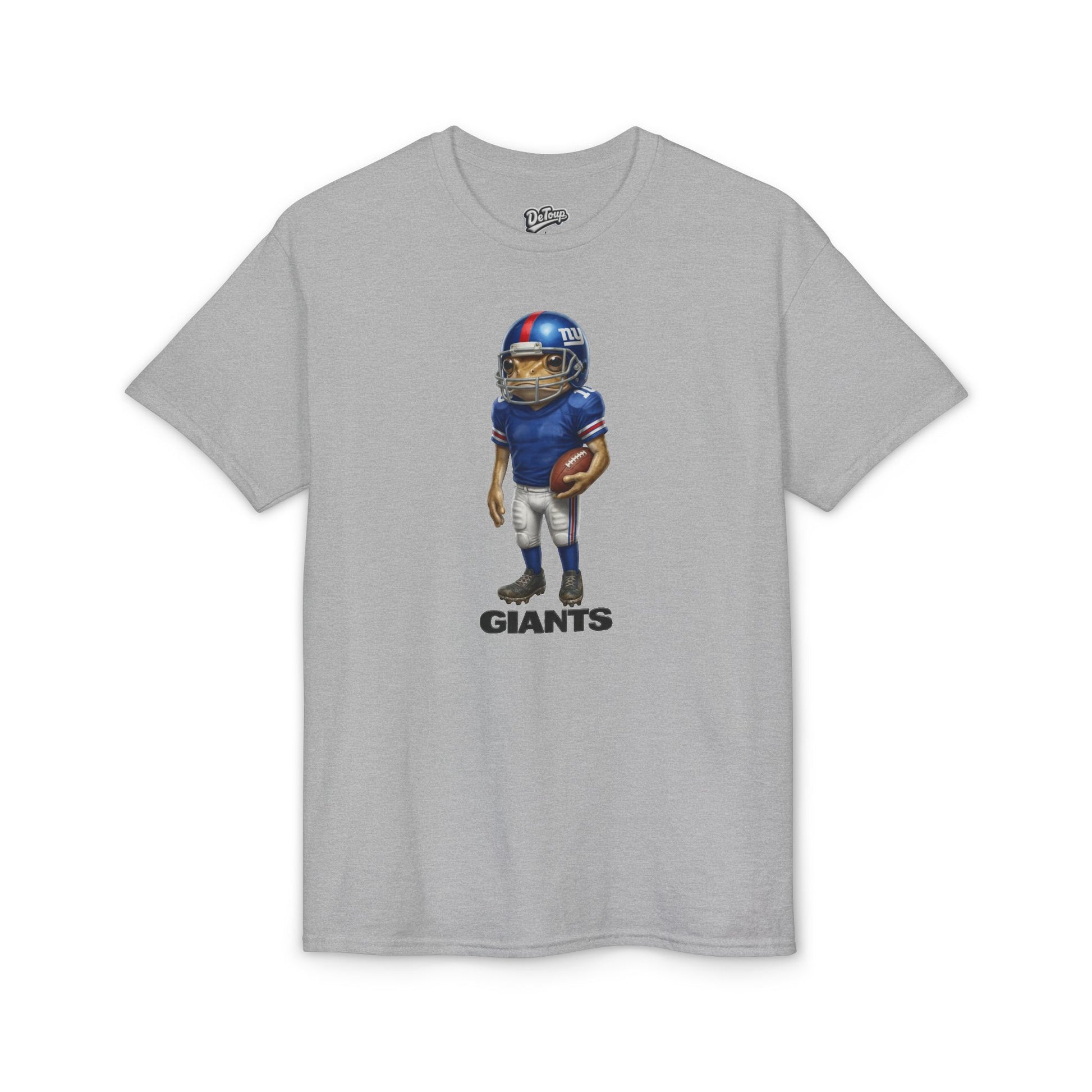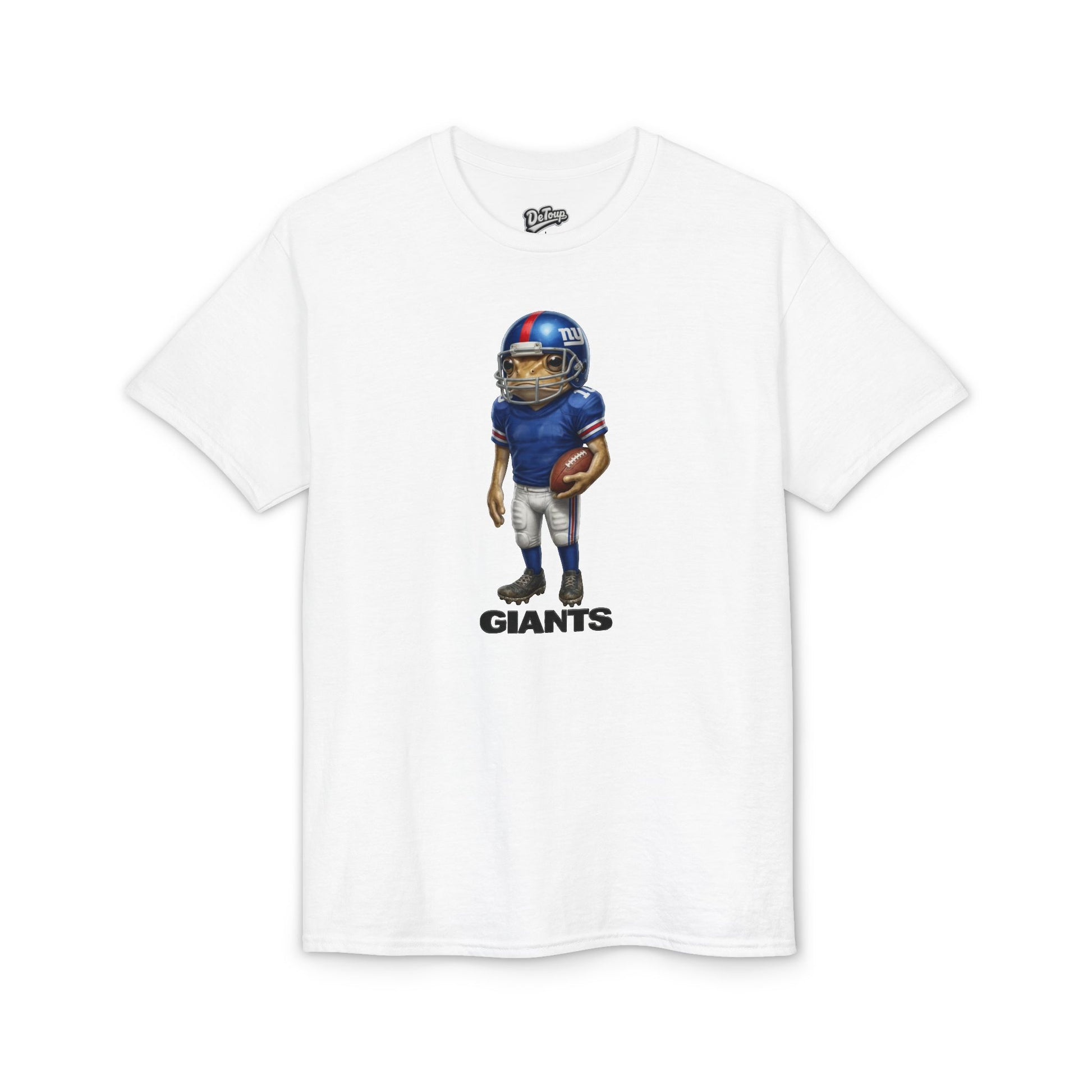 This soft, breathable tee brings game-day energy into everyday wear. The center-front design shows a helmeted football player in classic team colors, standing ready with the ball — a small, confident emblem that reads “GIANTS.” Wear it to tailgates, casual watch parties, or neighborhood strolls. The shirt drapes naturally and keeps you dry during warm crowds or quick walks, while the clean white canvas puts the artwork front and center. It fits into a fan’s life as a low-key way to show allegiance without shouting — comfortable, durable, and ready for repeat wears.