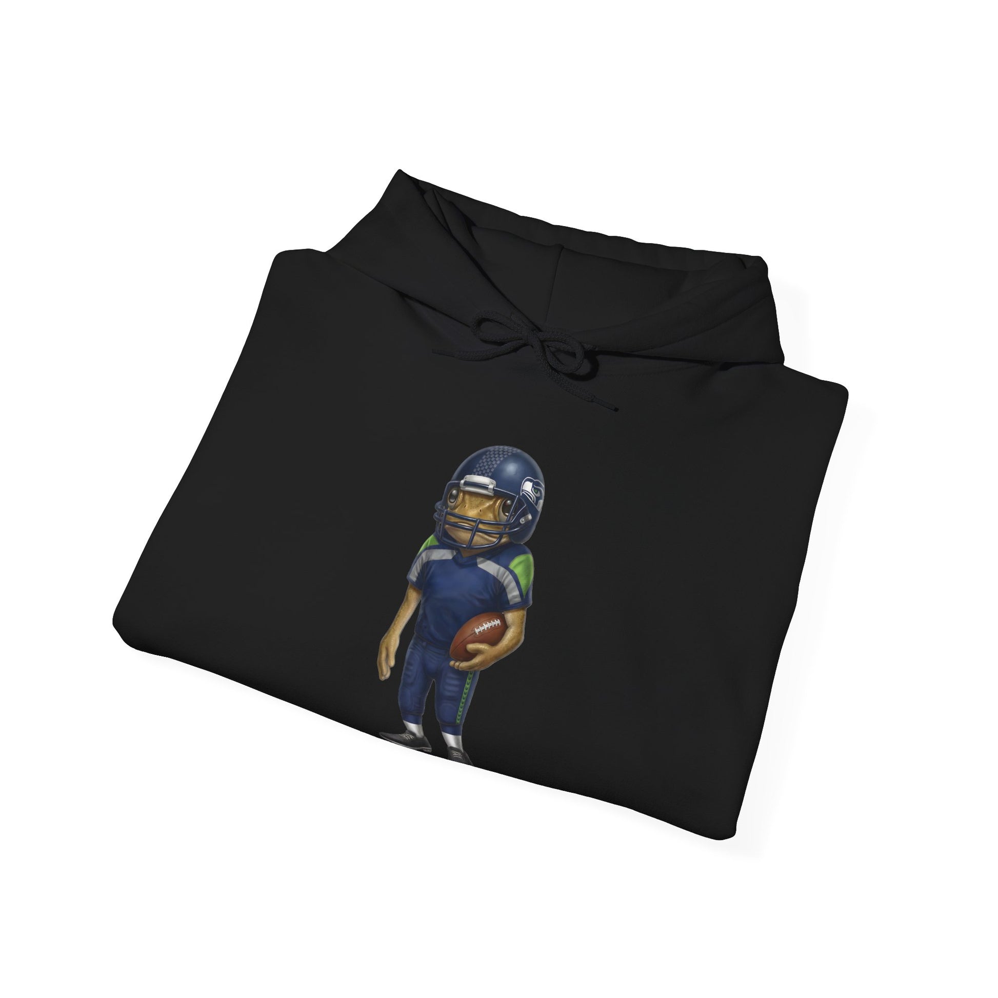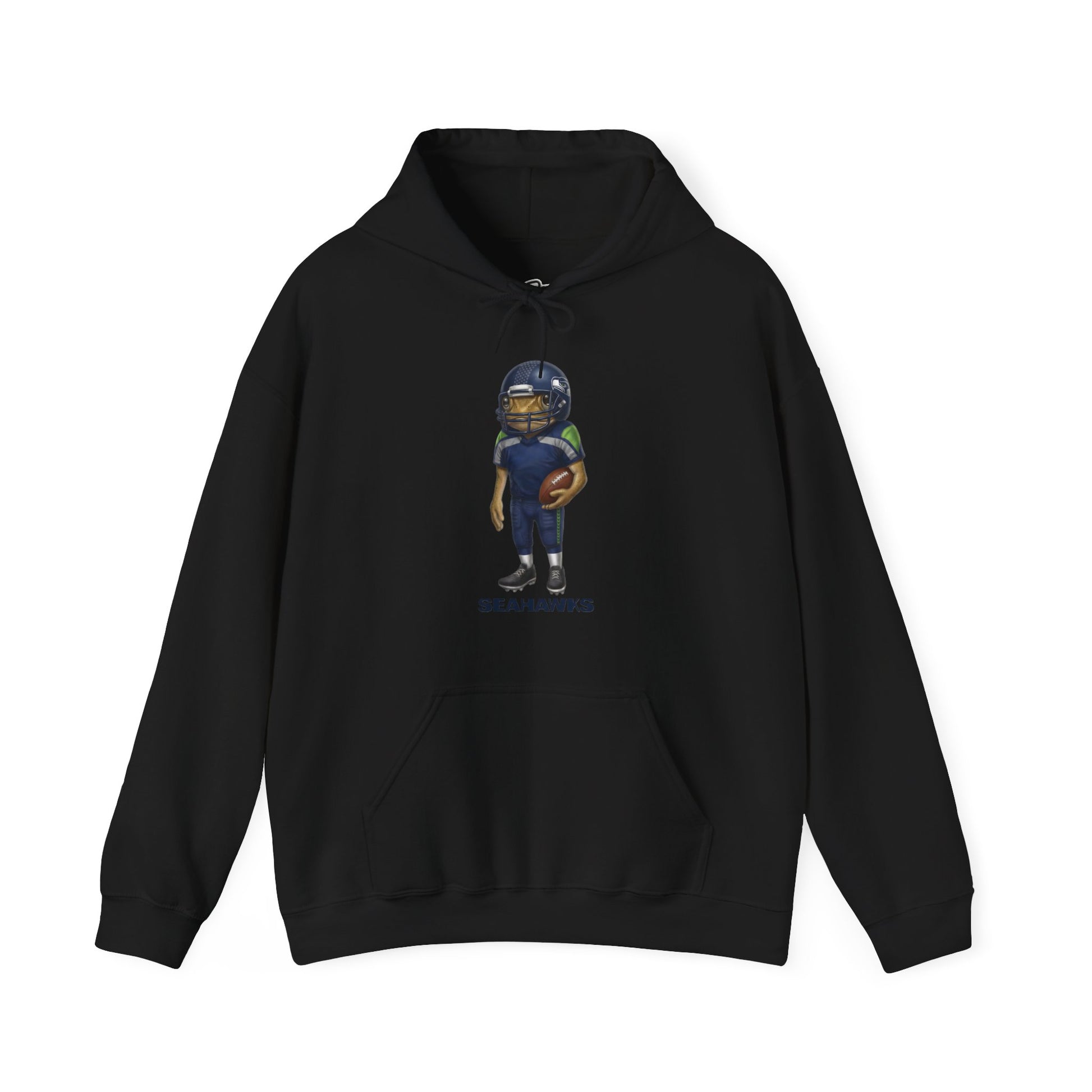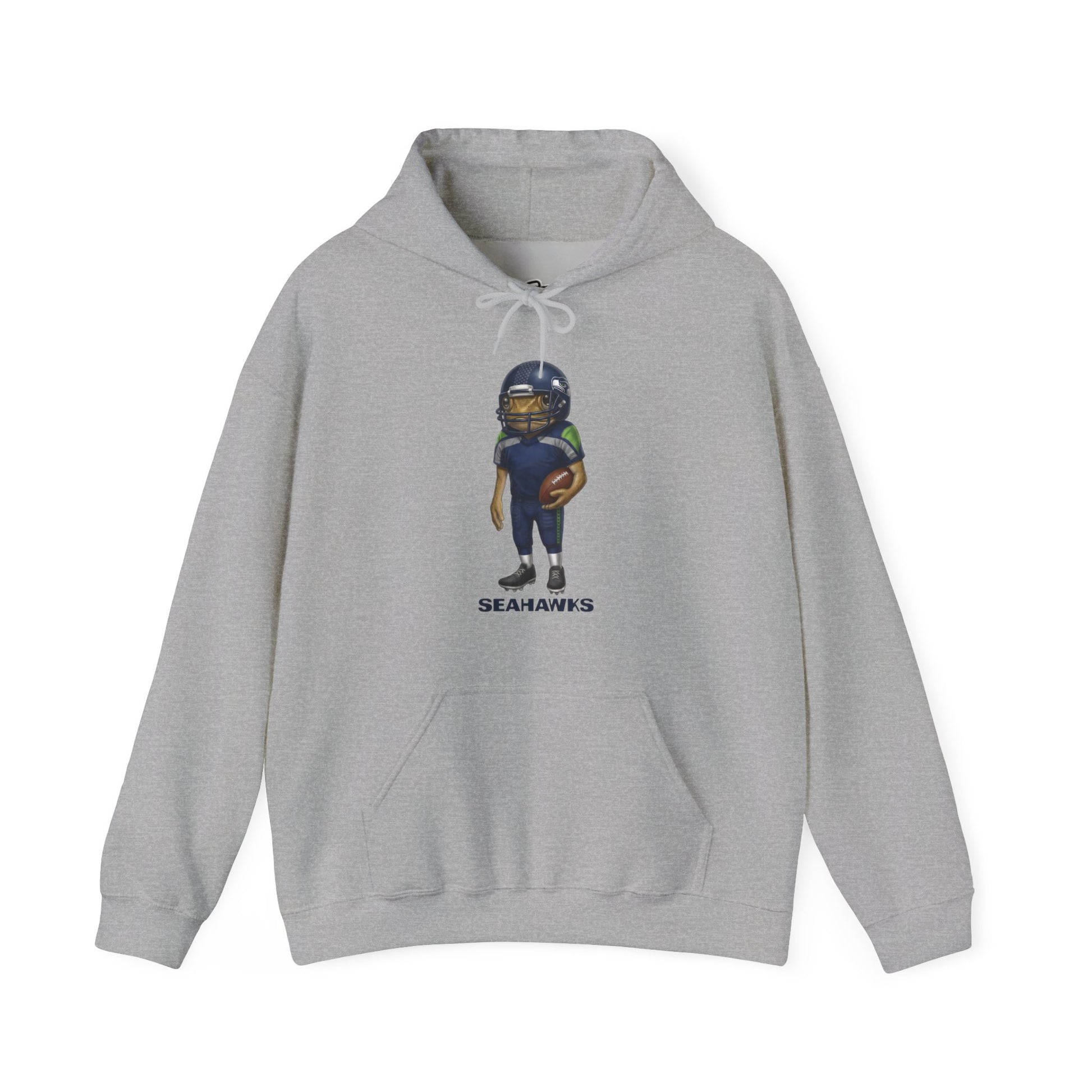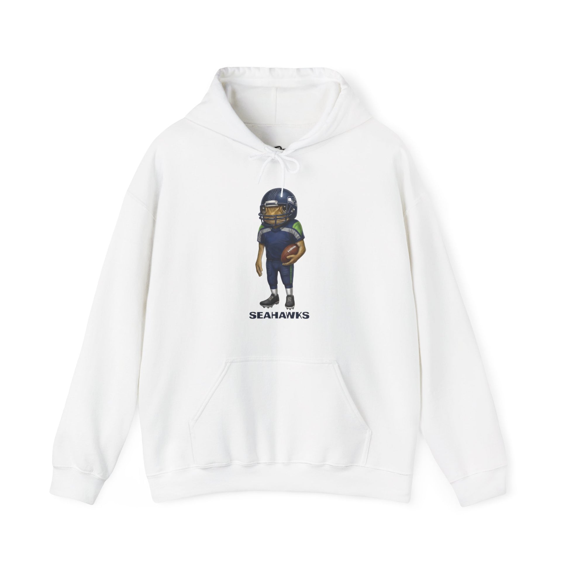 Soft, roomy hooded sweatshirt featuring a playful, hand-illustrated football player graphic and subtle team name beneath. The mid-weight 50/50 cotton-poly blend holds prints well and stays cozy on cool evenings. A double-lined hood with color-matched drawcord, roomy kangaroo pocket, and tear-away label keep comfort front and center. The design sits cleanly on the chest so the hoodie feels casual and expressive without being loud — wear it to watch the game, run errands, or curl up after a long day.